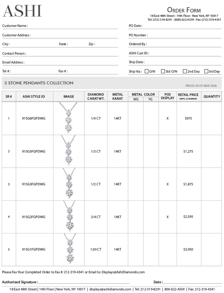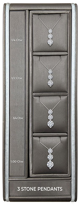 This Diamond Basics 3 Stone Pendants Display holds 4 styles. Most styles are available in additional Diamond Carat Weights and Metal Colors. If you wish to order additional styles, click here > or view similar styles on the product detail page.