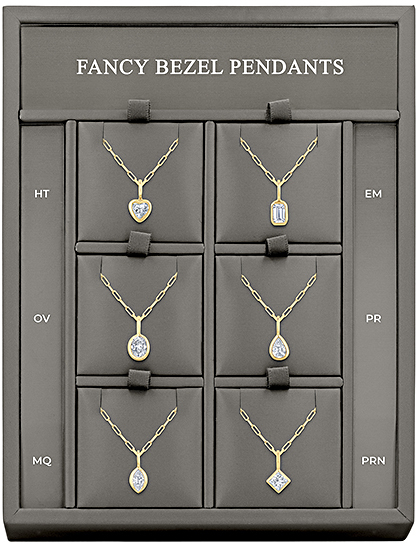 This Fancy Bezel Pendants Display holds 6 styles. Most styles are available in yellow and white gold. If you wish to order additional styles, click here > or view similar styles on the product detail page.